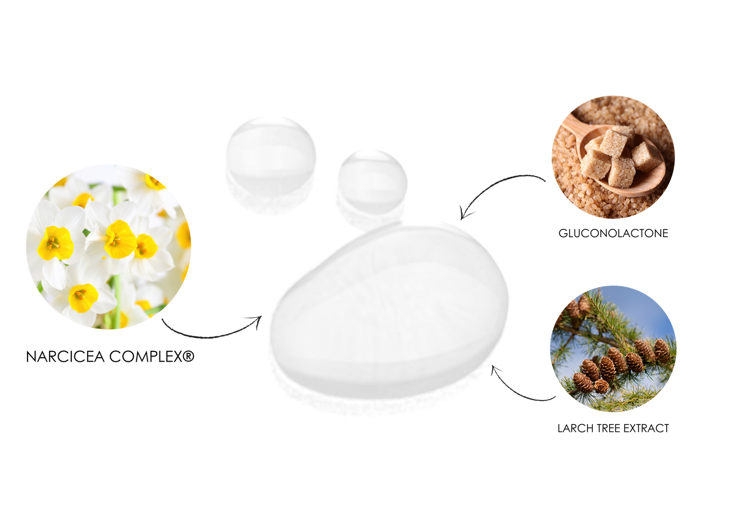 Le NARCICEA COMPLEX® , validé par des tests in vitro, s'attaque efficacement aux rides et aux signes de fatigue en ralentissant le vieillissement cellulaire, offrant une apparence plus jeune. Dans l'ESSENCE EXFOLIANTE, la GLUCONOLACTONE , un PHA dérivé du glucose pur par fermentation, rétablit l'équilibre du pH cutané en douceur et sans photosensibilisation significative, favorisant une activité enzymatique normale. De plus, l' EXTRAIT DE MÉLÈZE , provenant de mélèzes d'Amérique du Nord, diminue les ridules superficielles, améliore l'apparence de la peau et réduit la perte d'eau transépidermique.