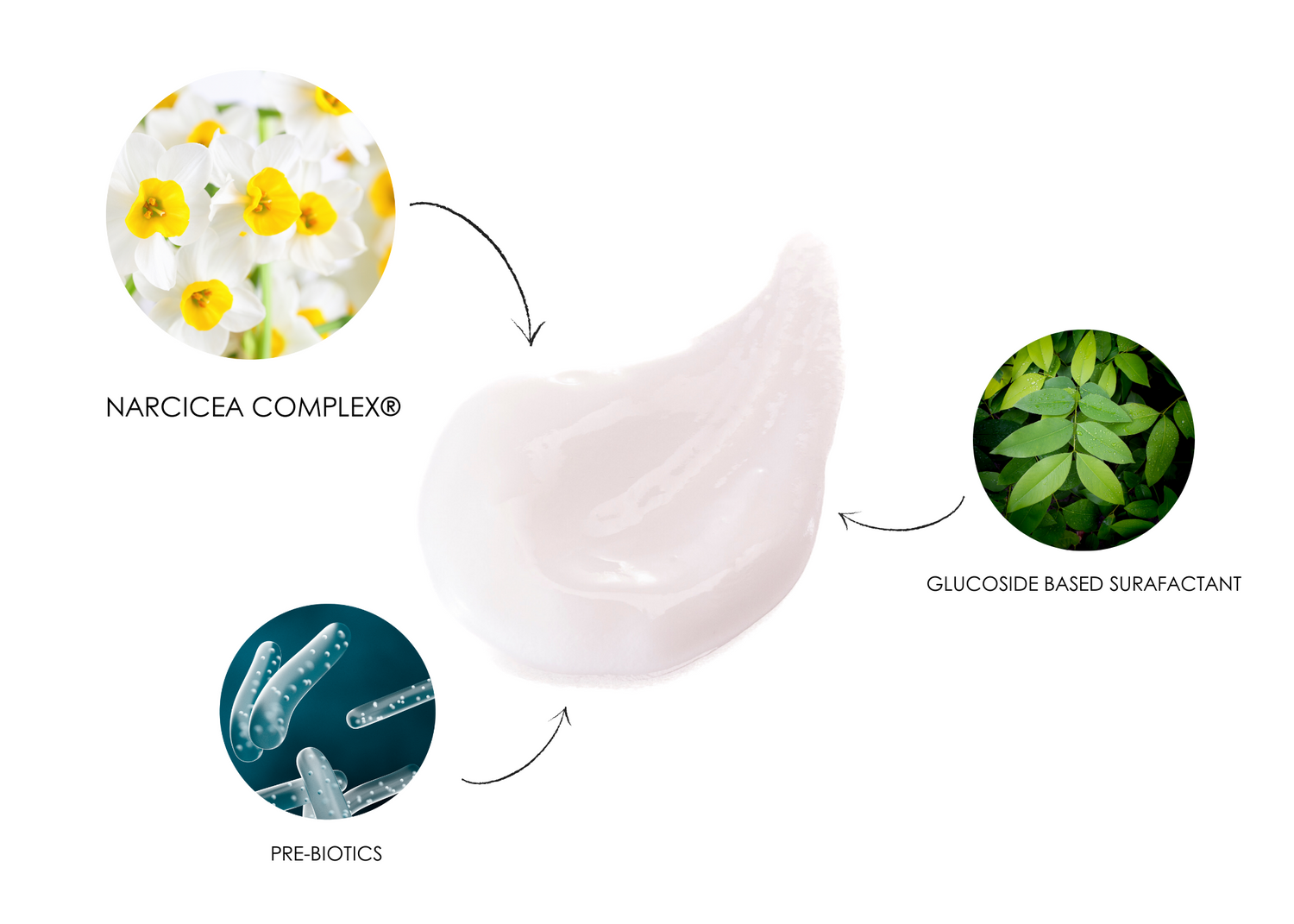 Le NARCICEA COMPLEX® , validé par des tests in vitro, s'attaque efficacement aux rides et aux signes de fatigue en ralentissant le vieillissement cellulaire, offrant une apparence plus jeune. LE SURFACTANT À BASE DE GLUCOSIDE est un nettoyant moussant doux dérivé du sucre. LES PRÉ-BIOTIQUES protègent l’écosystème cutané, favorisant la croissance de la flore résidente bénéfique par rapport à la flore pathogène.