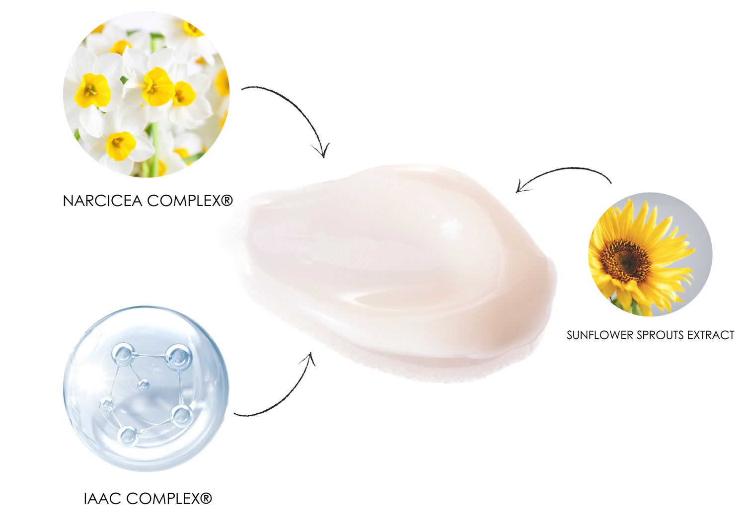 NARCICEA COMPLEX® diminue les rides et les signes de fatigue en ralentissant le vieillissement cellulaire, favorisant une apparence jeune. IAAC COMPLEX® associe des actifs anti-âge renommés comme le collagène et l'acide hyaluronique avec des éléments innovants, améliorant l'efficacité et agissant comme un aimant d'humidité. L'EXTRAIT DE GERMES DE TOURNESOL combine des pousses de tournesol biologiques et de puissants antioxydants du taratree, offrant un bouclier 3 en 1 contre les infrarouges (IR), la lumière bleue et la pollution, tout en maintenant et en améliorant la densité et la fermeté de la peau malgré l'exposition au soleil.