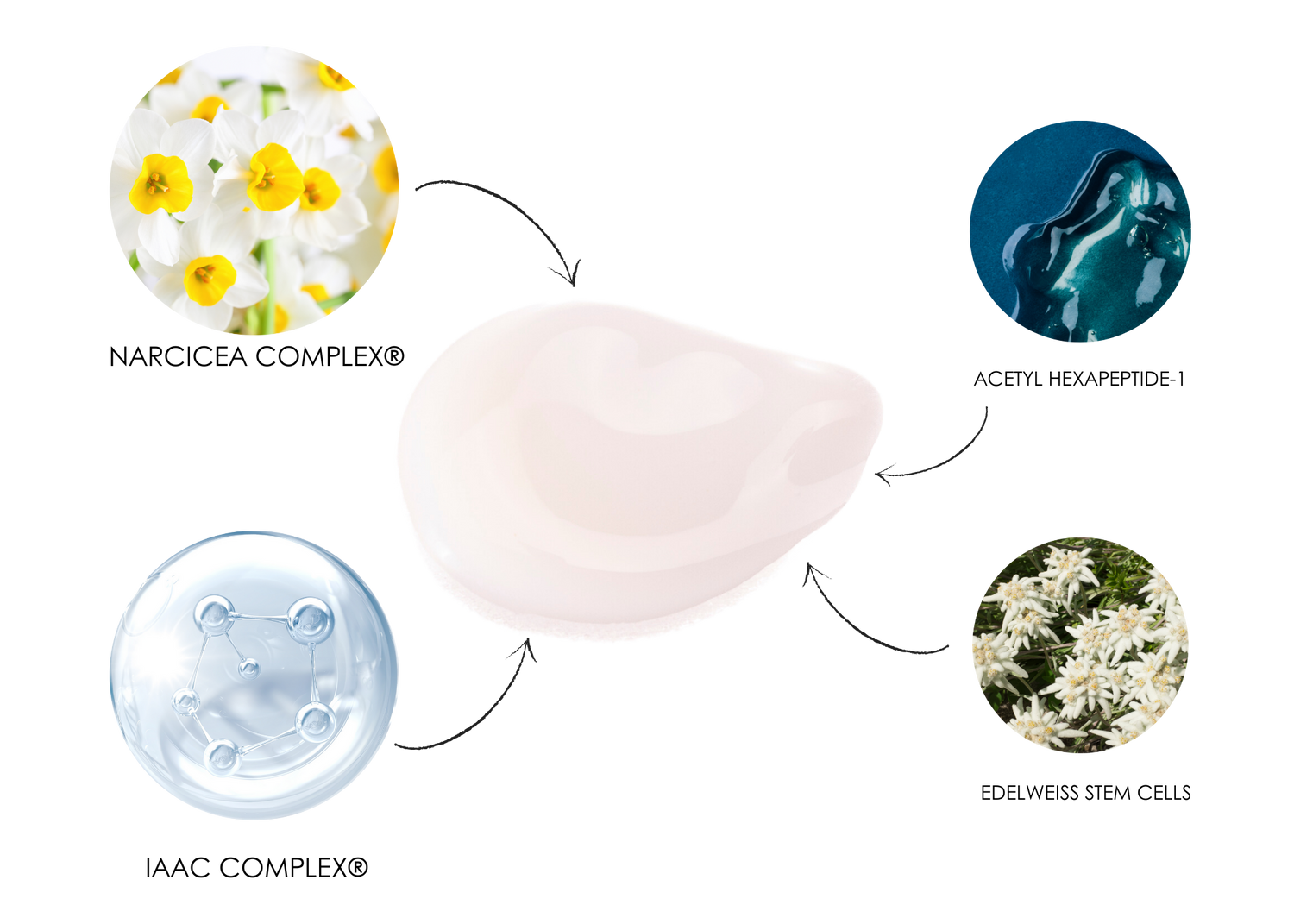 NARCICEA COMPLEX® réduit les rides et les signes de fatigue en ralentissant le vieillissement cellulaire, tandis que IAAC COMPLEX® associe des éléments anti-âge renommés à des additifs innovants pour une efficacité renforcée. ACETYL HEXAPEPTIDE-1 , un peptide innovant de type toxine botulique développé avec des experts en neurosciences, offre une action améliorée dans le traitement des rides d'expression. LES CELLULES SOUCHES EDELWEISS protègent contre le stress oxydatif (de la pollution de l'air et des rayons UV) et rajeunissent les tensions cutanées en revitalisant le dynamisme mitochondrial.